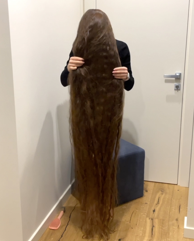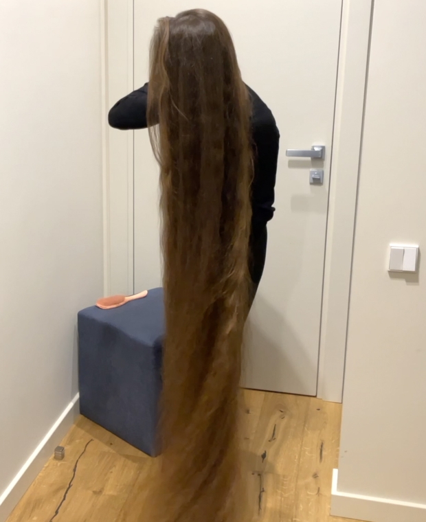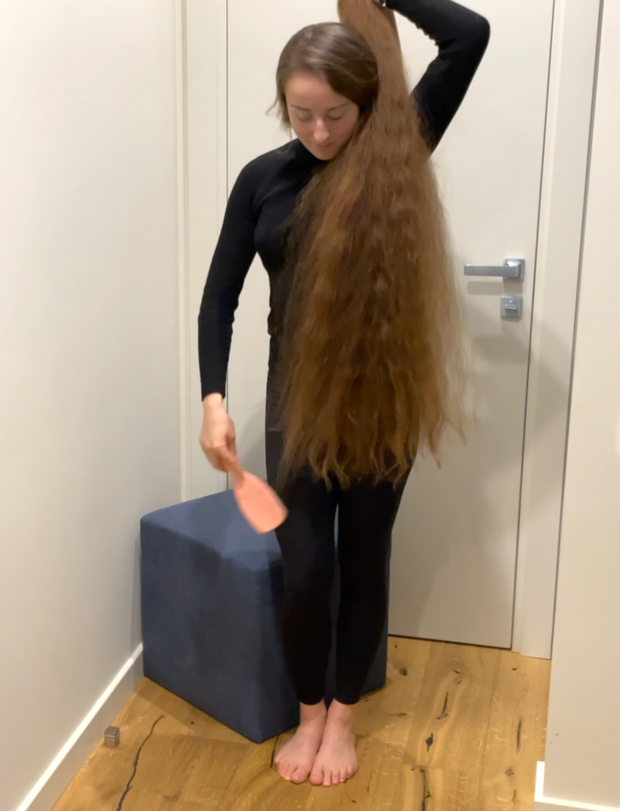 Alena's hair is slightly tangled in this video, and she carefully brushes it out until it's perfect and silky soft, so silky in fact that she can run her fingers through her hair, all the way from the top to the ends, all two meters of it!