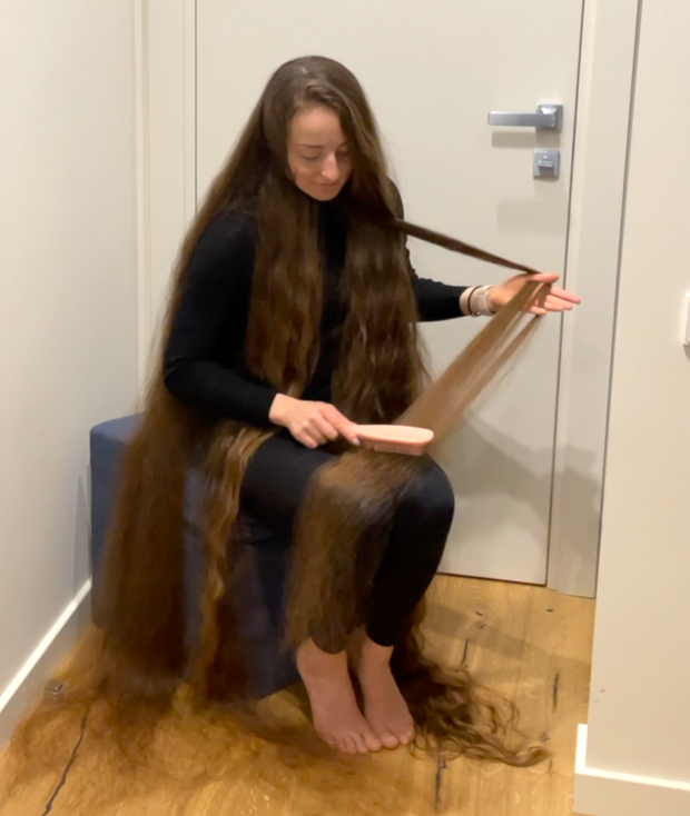 Sitting on a special chair, she brushes her hair while it's all around her feet since it's so long, and there's so much of it!