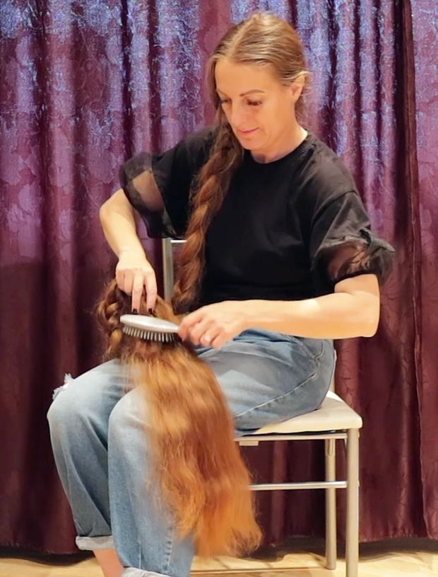 Watch as she undoes the braid, revealing extreme amounts of so much long hair that you will feel like swimming in hair!
