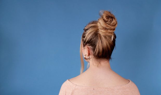 She makes several buns just to do great bundrops over and over again as well as some great hair play and display, on a perfect blue background.
