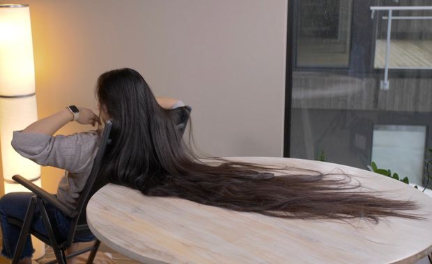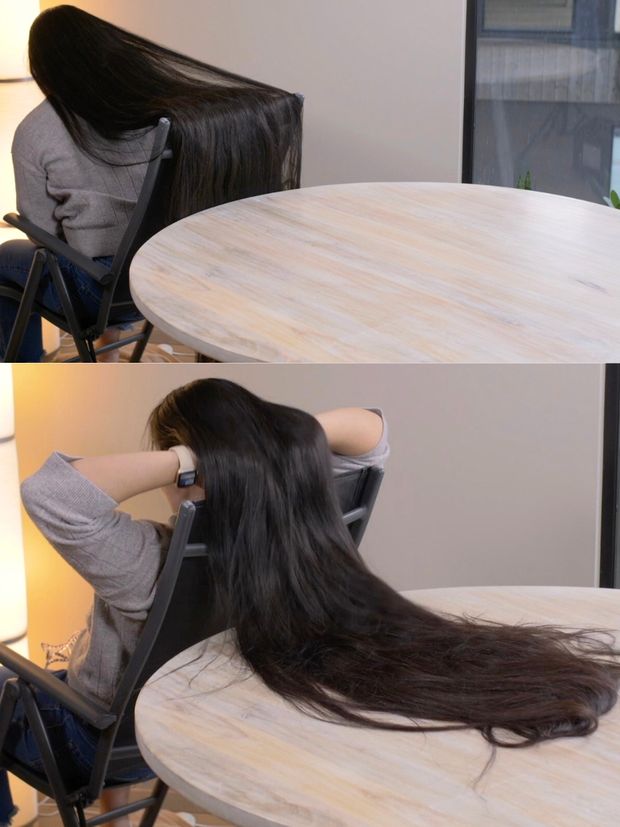 We love to see very long hair over the edge of a chair going onto a table and just spilling out everywhere, such as in this video. The edge o the chair creates a place for the heaviest parts of the hair to rest to ensure that the scalp gets enough rest as well as the fact that it creates great shine and light bouncing off the hair, especially with as shiny hair as this!Th