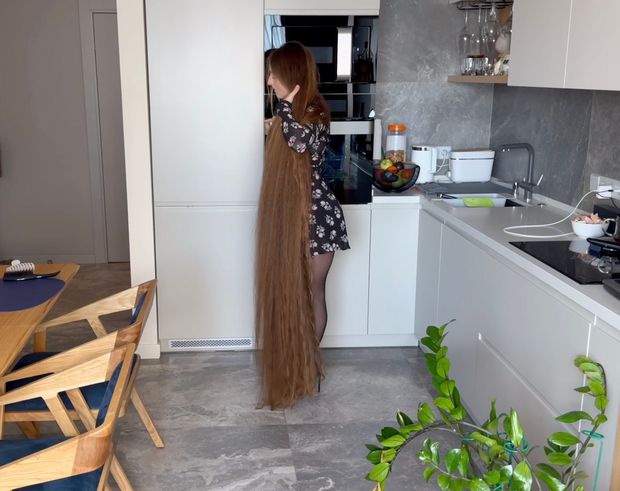 In this video, she is in a beautiful kitchen, showing off her hair by doing awesome hair play and display, full length, so that you can see the full beauty of her extra super long hair.
