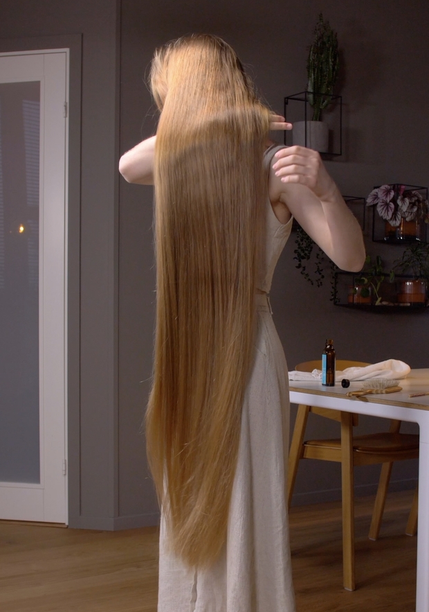 Watch as she oiles her super long blonde hair with argan oil to make it super shiny, soft and very silky.