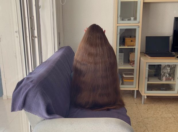 Watch as this highly skilled RealRapunzels model creates bun after bun and lets it down, making sure that her massive, very thick and long, heavy brown hair is all around her, making a pool of hair behind her in the sofa after covering her back completely.