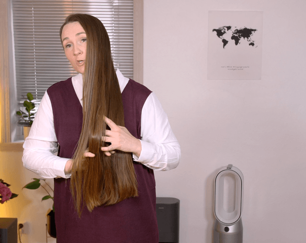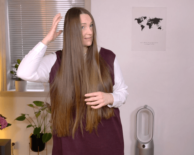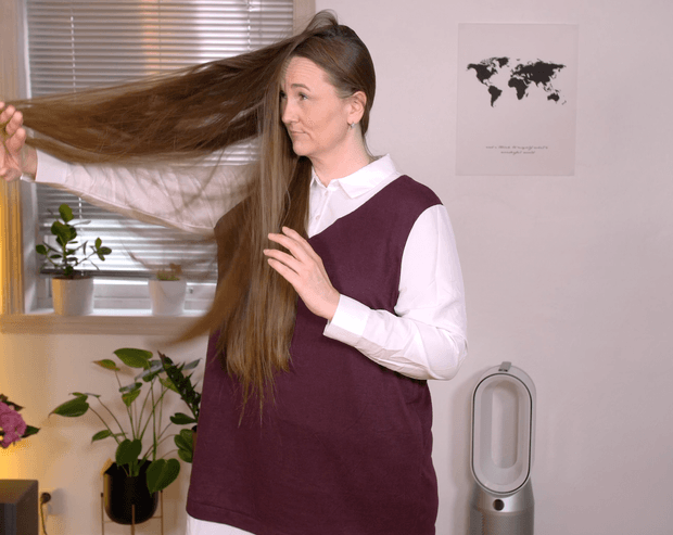 In this video, you will see long hair display, oiling, running her fingers through her long hair and more.